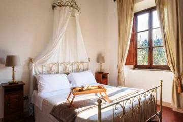 Romantico appartamento semi-indipendente con una camera da letto situato completamente a primo piano con scala esterna privata. Ambienti ricchi di fascino, con soffitti alti e travi a vista. Composto da: cucina ben attrezzata, disimpegno, bagno con vasca-doccia, corridoio, grande camera matrimoniale con letto a baldacchino, salotto che può essere trasformato in seconda camera. il tutto in circa 80 m2. Cucina attrezzata con frigo con freezer, 4 fuochi, forno, macchina caff�, lavastoviglie. Le finestre guardano sul pascolo della fattoria, sul bosco e sul giardino della villa